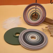 Our Silicone Teething Ring Set is best used from the earliest teething stages — usually around 3 to 6 months — and continues to be a comforting toy throughout toddlerhood. The unique silicone texture and round design make it a standout compared to hard plastic or cloth alternatives. It’s soft yet durable, fun to chew and safe to explore.