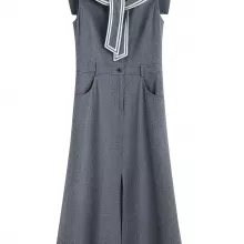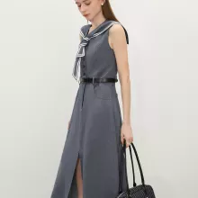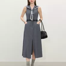 Crafted from a premium blend of rayon, polyester, and linen, this dress offers a soft, breathable feel without sacrificing structure. The sleeveless cut and slim-fit bodice enhance your silhouette, while the sailor-inspired collar adds a touch of vintage polish. Although it has a denim-inspired look, the knit viscose fabric ensures it’s lightweight and easy to wear—perfect for sunny days and warm evenings.