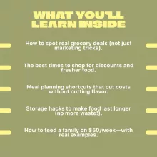 - Meal planning shortcuts that cut grocery bills in half (without eating the same thing every day).