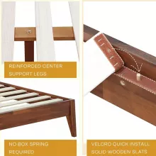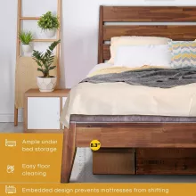 Made from 100% FSC-certified Acacia wood, this bed frame is a celebration of nature’s finest materials. The unique grain patterns and natural finish of the headboard add a timeless charm to your room. With its high-profile design and spacious 84.5-inch length and 63-inch width, it accommodates most mattresses and supports them with reliable strength.