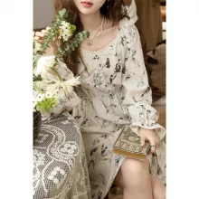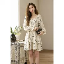 Our dress features a loose fit silhouette that gracefully outlines any figure, complemented by a knee-length cut that offers both style and modesty. The square neckline pairs beautifully with the flare sleeve style, providing a retro yet refined look. Enhanced with delicate lace decorations, the dress stands out with its artistic ink floral patterns, which evoke a sense of elegance and artistic flair.