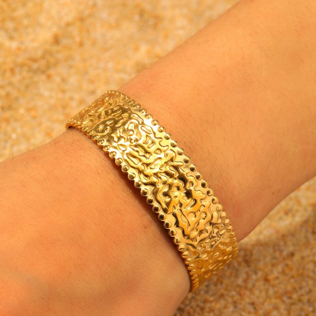 This bracelet is more than just an accessory — it’s a statement of timeless elegance. Whether worn to a wedding, engagement party, business event, or simply for a casual day out, it complements every occasion. The geometric embossed pattern brings a refined texture to your look, while the high-polished surface catches the light beautifully. Thanks to its durable stainless steel construction, you’ll enjoy a piece that won’t fade or lose its luster, no matter how often you wear it.