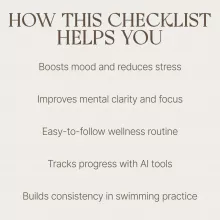 Unlike other generic swimming guides, this wellness checklist is specifically tailored to address the mental health benefits of swimming. It combines practical advice with actionable steps and cutting-edge AI tools to track your progress. Plus, it provides a holistic approach to wellness by focusing not only on physical fitness but also on emotional and cognitive benefits. Whether you’re swimming in a pool, lake, or beach, this guide helps you maximize the mental clarity, mood improvements, and anxiety reduction that come with each swim.