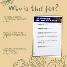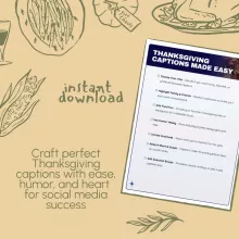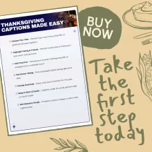 Get your Thanksgiving Captions Made Easy checklist today and make your holiday posts unforgettable. With 10 thanksgiving captions you can copy and paste, you’ll always have the perfect words ready. Click “Add to Cart” now and start sharing your gratitude, humor, and heart this Thanksgiving!