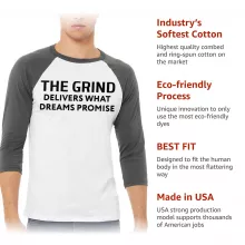 The Grind Delivers What Dreams Promise Baseball T-Shirt is proudly made with 7x less water than average manufacturers, in recycle-friendly facilities that also guarantee zero sweatshop conditions. Hustle Quote 3/4 Sleeve is designed and printed in California.