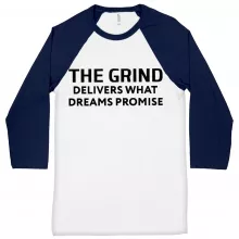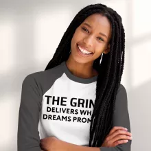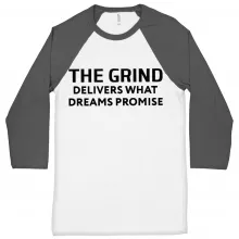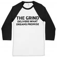 The Grind Delivers What Dreams Promise Baseball T-Shirt – Hustle Quote 3/4 Sleeve – Work Hard Graphic Raglan Jersey Shirt