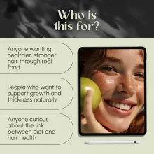 Unlike other generic ebooks, The Guide to Food for Strong, Healthy Hair goes beyond beauty trends and dives into real, science-backed strategies. With easy-to-digest content and practical tools like a 1-day sample meal plan and weekly hair nutrition tracker, this guide empowers you to take action—not just read advice.
