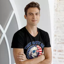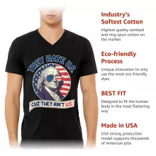 They Hate Us Cuz They Ain’t Us V-Neck T-Shirt is proudly made with 7x less water than average manufacturers, in recycle-friendly facilities that also guarantee zero sweatshop conditions