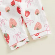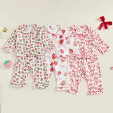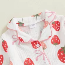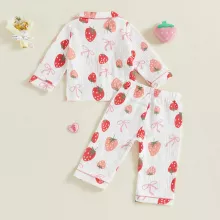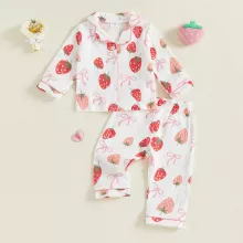 Wrap your little one in comfort and charm with this adorable Pajama Set for toddler girls. Designed for cozy nights and playful mornings, this two-piece sleepwear set features a button-up long sleeve top with a sweet lapel collar and a matching pair of soft pants. The delightful bow and strawberry prints bring a playful touch that your child will absolutely love. Whether it’s bedtime, lounging at home, or snuggling during storytime, this pajama set keeps your girl warm, comfy, and irresistibly cute.