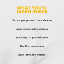 Unlike generic gift guides, this resource combines emotional insight, creativity, and modern tools like AI. You’ll not only learn how to personalize gifts for your partner but also how to build traditions that deepen your connection over time. Every chapter blends storytelling, psychology, and practical steps to help you give with intention.