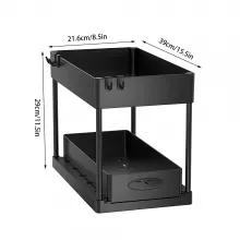 Featuring a sleek, minimalist design, this under sink organizer seamlessly integrates into any household style. The sliding pull-out drawers allow for effortless access to your items, while the double-layer design maximizes vertical space. With four side hooks and a hanging cup, you’ll have additional storage for small items like sponges, brushes, and more. Say goodbye to clutter and hello to a tidy, organized space.