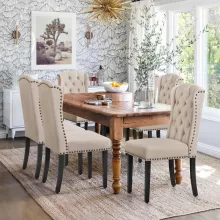 Redefine your dining space with this set of two beautifully upholstered dining chairs, designed to bring both classic sophistication and modern comfort to any room. Featuring a timeless tufted design, solid rubberwood legs, and elegant bronze-finished nailhead trims, these chairs are as stylish as they are durable. Whether you’re setting the table for a formal dinner or enjoying a cozy family meal, these chairs instantly add charm and character to your kitchen or dining room.