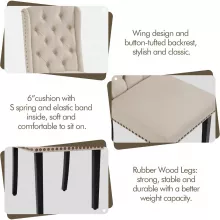 Each chair is upholstered in wear-resistant fabric that offers a smooth and soft feel while standing up to everyday use. The high, slightly arched backrest with deep button tufting ensures comfortable support, while the wingback silhouette adds a refined touch. The metallic nailhead trims lining the edges create a stunning visual accent that complements both traditional and modern decor styles. Sturdy black-finished rubberwood legs not only enhance stability but also add to the chair’s striking appearance.
