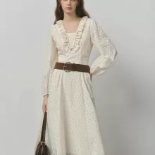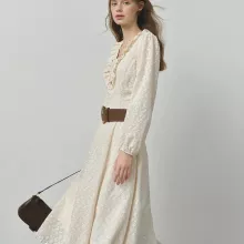 - Delicate Lace Trim: Lace accents along the hem and sleeves enhance the dress’s romantic appeal.