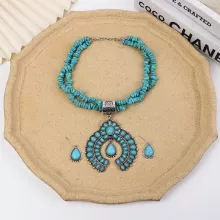 Elevate your jewelry collection with this vintage-inspired white turquoise squash blossom necklace and earrings set. Its unique design and elegant synthetic stones make it a must-have for anyone who values artistry and adventure in their accessories. Add this captivating set to your wardrobe now and experience the perfect blend of timeless beauty and modern boho chic.