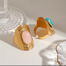 Make a statement that turns heads with this vintage-inspired chunky open ring. Designed with a unique hyperbolic silhouette, this eye-catching piece showcases natural green and pink stones that add an earthy elegance and a pop of color to your look. Crafted from durable stainless steel and finished with 18K gold plating, this ring blends timeless charm with long-lasting quality. Whether you’re dressing up for a night out, heading to a wedding, or just adding flair to your everyday outfit, this ring is made to shine.