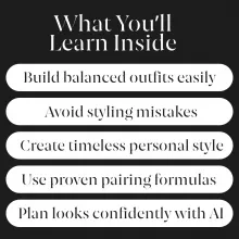 Unlike generic styling ebooks, this guide goes beyond basic outfit tips. It teaches you the mindset of a curator—how to assess value beyond price, how to structure an outfit like architecture, and how to intentionally contrast textures and eras. The included real-life case studies make the concepts practical and relatable, while the exclusive AI prompts give you a modern tool to design and refine your looks visually.