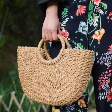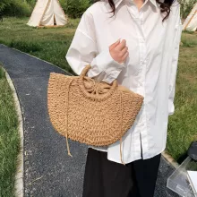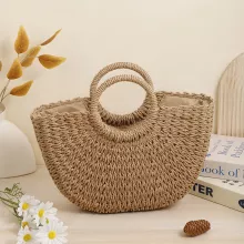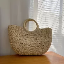 Featuring a unique moon-shaped silhouette, this tote is handmade from durable straw with a firm structure that holds its shape while adding a rustic charm to any outfit. The open-top design offers easy access to your essentials, while the soft polyester lining helps keep everything neatly in place. Its minimalistic look, combined with vintage-inspired weaving, makes it a fashion-forward choice that feels relaxed yet refined.