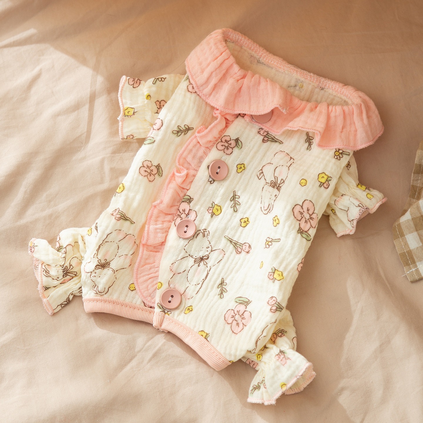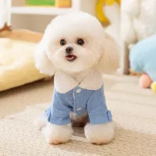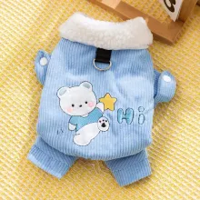 Made from high-quality polyester corduroy, this four-legged coat is lightweight yet insulating—perfect for cold weather. Its embroidered details add a subtle charm, while the built-in traction feature allows easy attachment to your leash for safer outdoor adventures. The snug fit keeps your dog warm without restricting movement, making it ideal for daily wear during fall and winter.