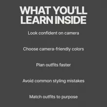 This ebook is ideal for entrepreneurs, creatives, influencers, professionals, photographers’ clients, and anyone planning a photoshoot who wants polished results without hiring a stylist.
