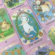 - 78 unique tarot cards featuring cute, whimsical illustrations of cats.