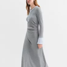 This dress is made for women who want to feel polished, confident, and comfortable all day long. The soft knit fabric has a slight stretch, allowing easy movement while maintaining a smooth, structured look. The round neckline and full-length sleeves give it a refined, winter-ready feel, making it perfect for both professional and casual settings. The mid-calf length adds sophistication, whether you’re wearing it with boots or heels.