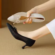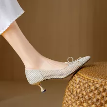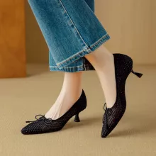 Women Pumps Pointed Toe Thin Heel Shoes with Bow-knot Mesh Upper