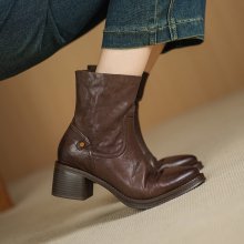 Women’s Ankle Boots Round Toe Chunky Heel Leather Zipper