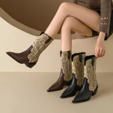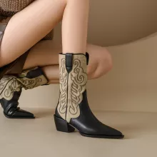 Elevate your fall wardrobe with these stunning Women’s Autumn Pointed Toe Chunky Heel Western Boots. Designed to combine comfort with a touch of bold elegance, these boots are perfect for women who want to stand out while staying cozy. Featuring a chic pointed toe and a sturdy 1.6-inch chunky heel, these slip-on boots bring together classic Western charm and modern flair.