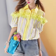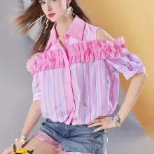 This blouse is best worn in summer, when you want something cool yet stylish. It’s ideal for casual outings, concerts, festivals, or just strutting through the city. Its single-breasted front and classic collar bring a touch of structure, while the short sleeves and cropped cut keep things fresh and fun.