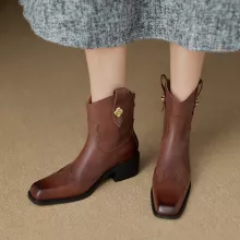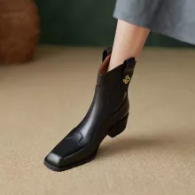 Crafted from high-quality cowhide leather, both the upper and the shaft of these ankle boots are designed to be durable and luxurious. The sheepskin lining and insole ensure that your feet stay warm and comfortable, while the rubber outsole offers excellent traction and stability. The rear zipper closure adds convenience, making these boots easy to slip on and off. With a striking square toe and a chunky high heel of 4.5 cm, these boots add a touch of retro sophistication to your wardrobe.