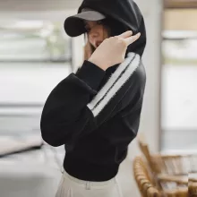 Women’s Street-Style Black Long Sleeve Hoodie Cardigan Striped Zipper Jacket