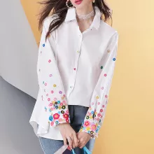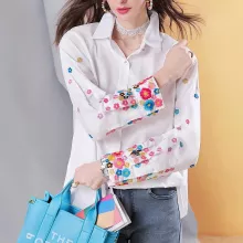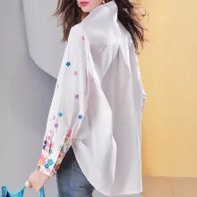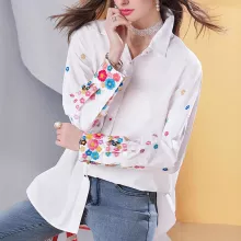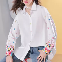 What truly sets this blouse apart is its intricately embroidered floral sleeves. The detailed stitching adds a romantic flair that’s both subtle and eye-catching, making it more than just a basic shirt. The white base offers a clean canvas that pairs effortlessly with denim, leggings, or tailored trousers—making it as versatile as it is beautiful.