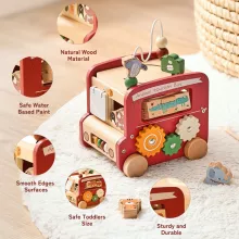 Crafted from high-quality wood and finished with safe, water-based paint, the activity bus is soft to the touch and gentle for little hands. Its bright cartoon-animal design sparks imagination, while the built-in features — including musical elements, bead winding tracks, shape puzzles, and movable parts — encourage active exploration.