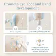 The soft, plush cloud and hot air balloon designs are complemented by a gentle rattle and music box that plays calming melodies, helping to lull your baby into a relaxed state. Crafted from safe, eco-friendly materials, this mobile offers a combination of sensory stimulation and peaceful sound, making it an ideal companion for your baby’s early months. It’s also easy to install and fits most standard cribs, making it the perfect addition to any nursery.