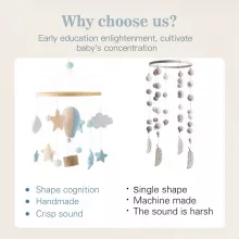 Made from high-quality wood and soft cotton, this mobile is designed with both safety and style in mind. It’s the perfect blend of playful charm and soothing function. Whether it’s for nap time or playtime, your baby will be enchanted by the colors, textures, and gentle music. This crib mobile also makes a thoughtful gift for baby showers, ensuring the new parents have a functional and beautiful addition to their baby’s room.