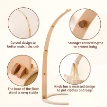The product offers essential features every parent appreciates. It is made entirely of durable wood and includes a floor stand that supports hanging toys, rattles, or musical bells. The stand accommodates infants and young children across a wide age range, making it a long-lasting nursery companion. Its natural materials and soft tones make it special—simple, elegant, and thoughtfully designed for baby-safe play.