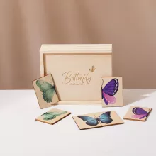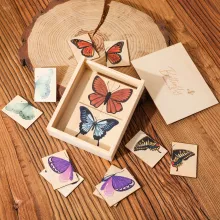 This baby-friendly jigsaw puzzle is made from durable, natural wood with smooth, rounded edges that are safe for tiny hands. The bright, colorful image of a butterfly captures attention while promoting visual recognition and color matching. Thanks to its simple design, your child can easily grip and place each puzzle piece, making it ideal for encouraging hand-eye coordination and problem-solving skills. The puzzle comes in a charming wooden gift box, perfect for gifting and easy storage.